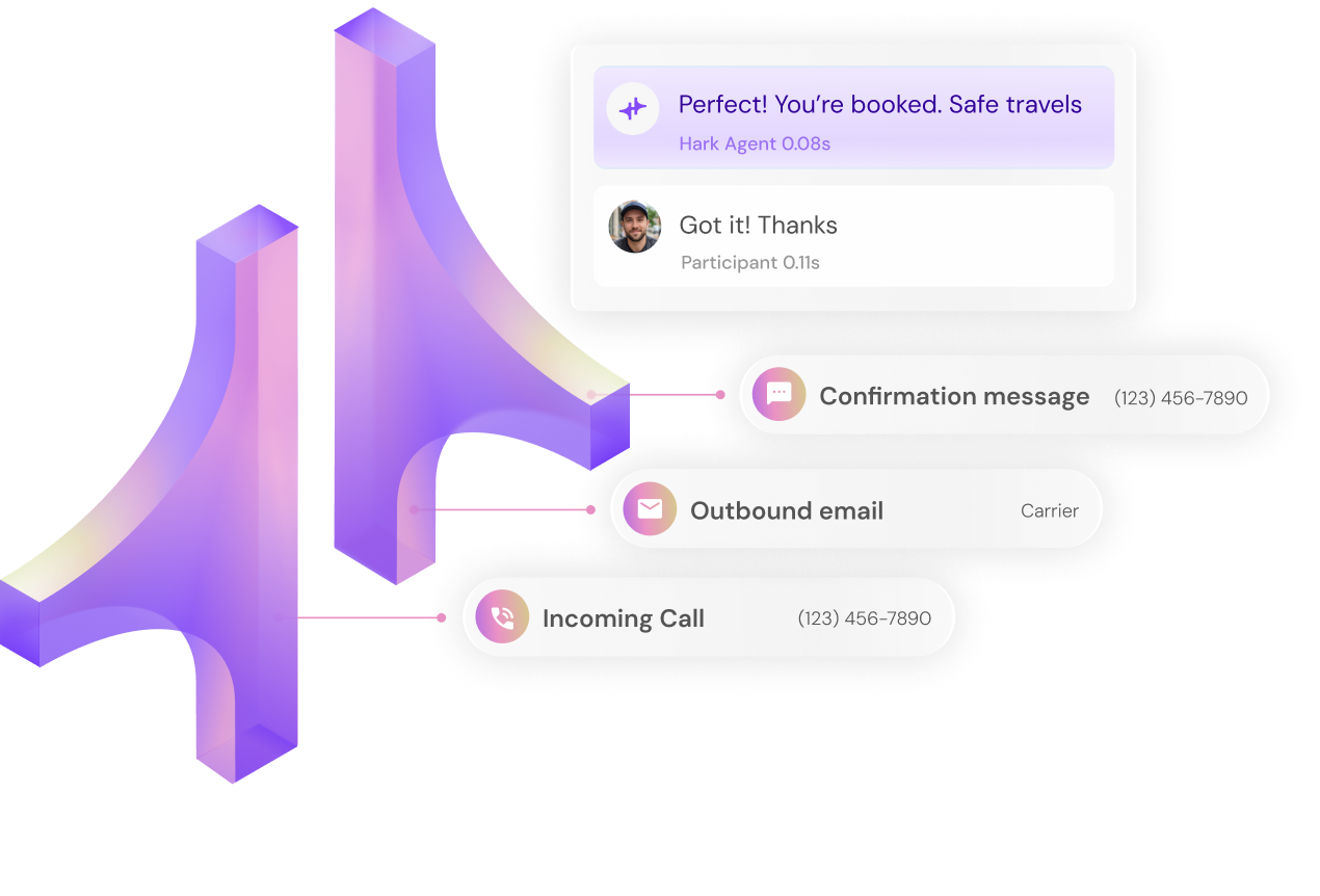 Automate routine jobs like - booking, scheduling, dispatching, verifying, collections and more - with AI agents that call, email and text, understand natural language, update internal systems, and take action automatically.